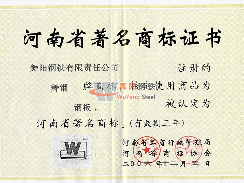 舞陽鋼鐵公司-河南省著名商標(biāo)稱號