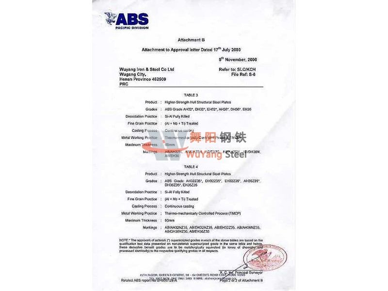 舞陽鋼鐵ABS(美國) 船舶船級(jí)社認(rèn)證證書